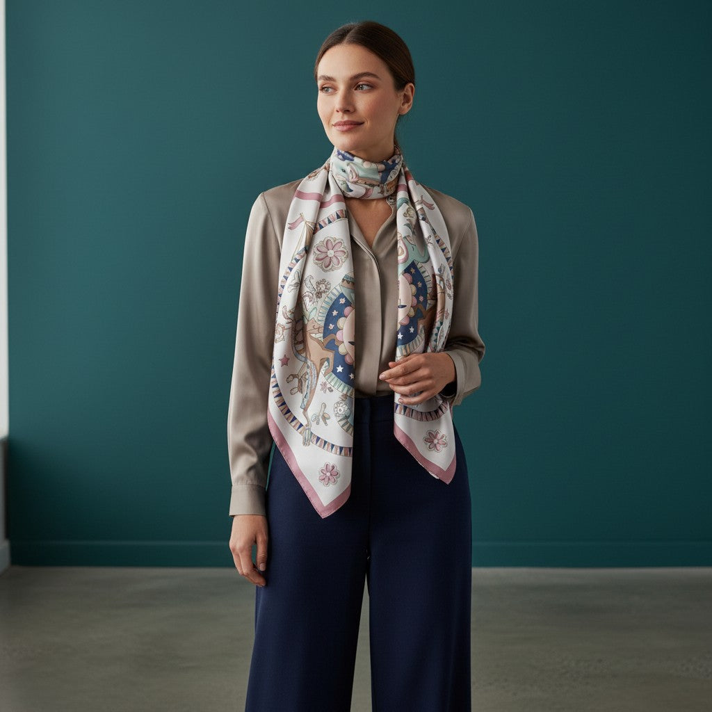 This scarf depicts a fairytale, circus-like scene, arranged symmetrically and harmoniously. A large, round geometric motif dominates the center, serving as a frame, embellished with stars, flowers, and decorations. Surrounding it are animal figures such as prancing horses, ornate elephants, monkeys, and dolphins, seemingly performing tricks and acrobatics. At the bottom, a small human figure stands out, supporting the weight of the composition, like a circus performer supporting the entire show. Decorative elements such as tents, festoons, and floral motifs evoke the atmosphere of a magical, timeless stage.