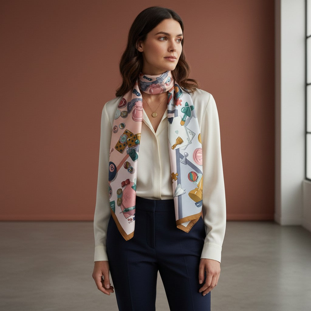 In this scarf, artist Lorenzo Valdieri blends illustration and design to evoke a world of timeless games. This scarf features a vibrant interweaving of objects related to the world of games and entertainment. It depicts chess pieces, dice, board games, dominoes, a large billiards figure eight, playing cards, puzzles, spinning tops, marbles, and bingo symbols. Also visible are a dart, a drawstring bag, and some letter and number cubes, evoking a playful, childlike atmosphere. The design is rich in detail and creates a dynamic effect, almost as if the objects were randomly scattered across a surface. Choose your game...happy playing!