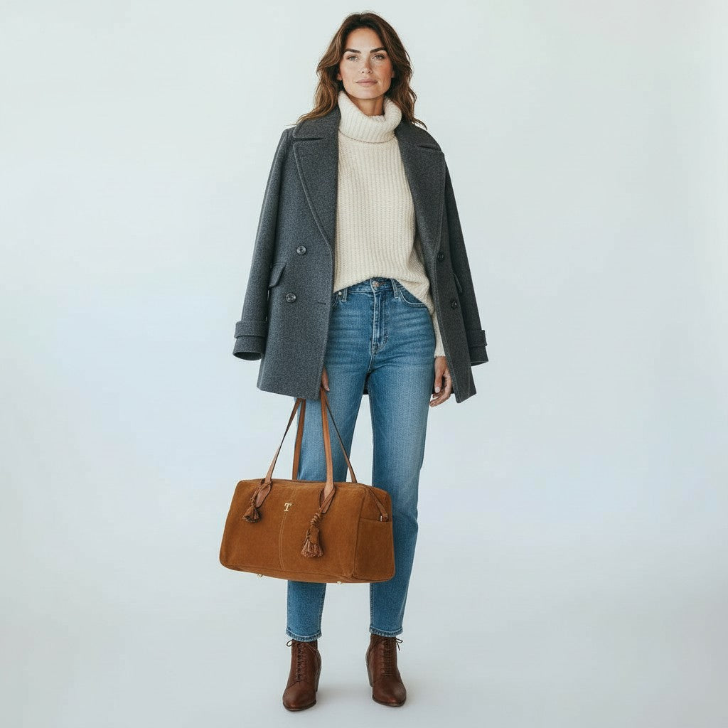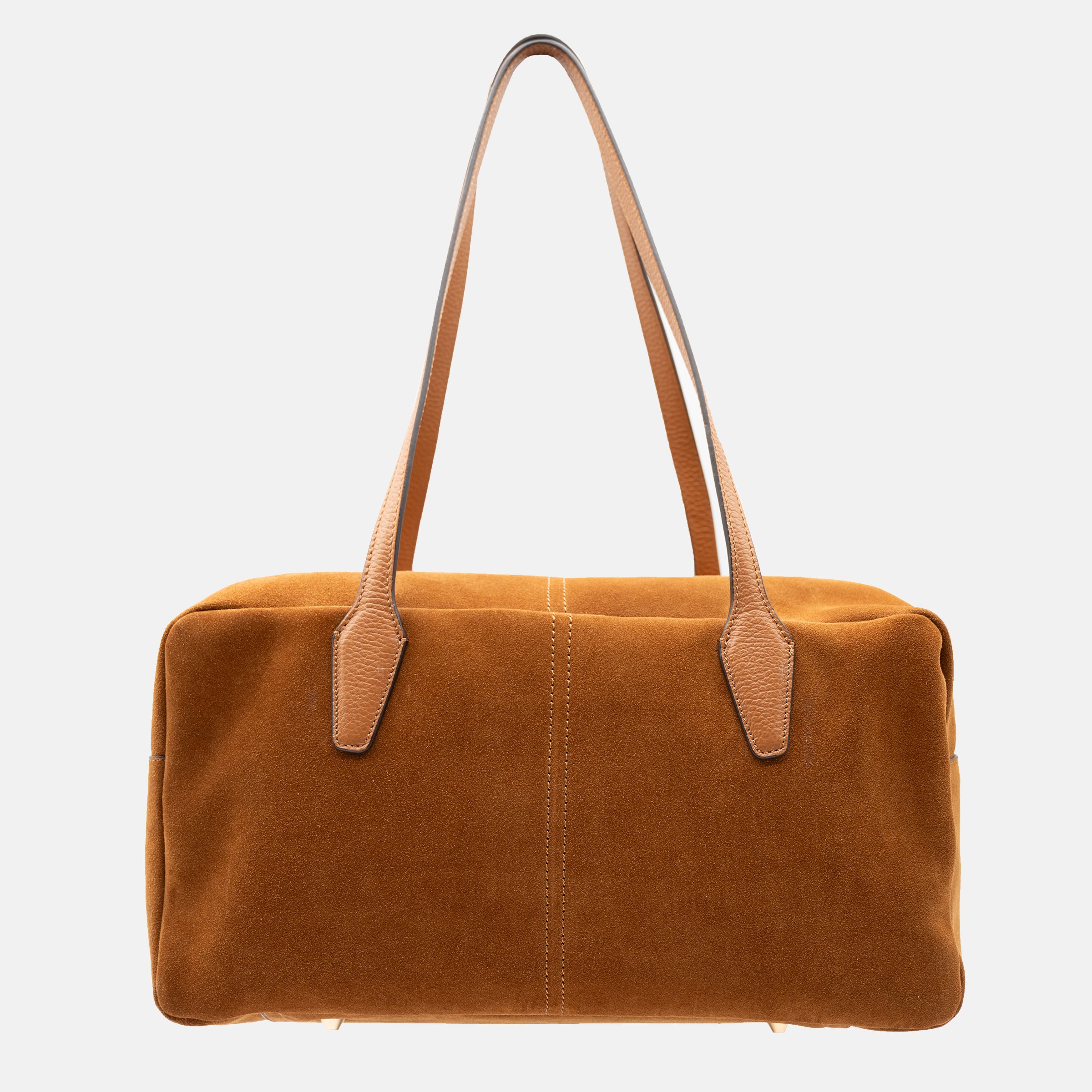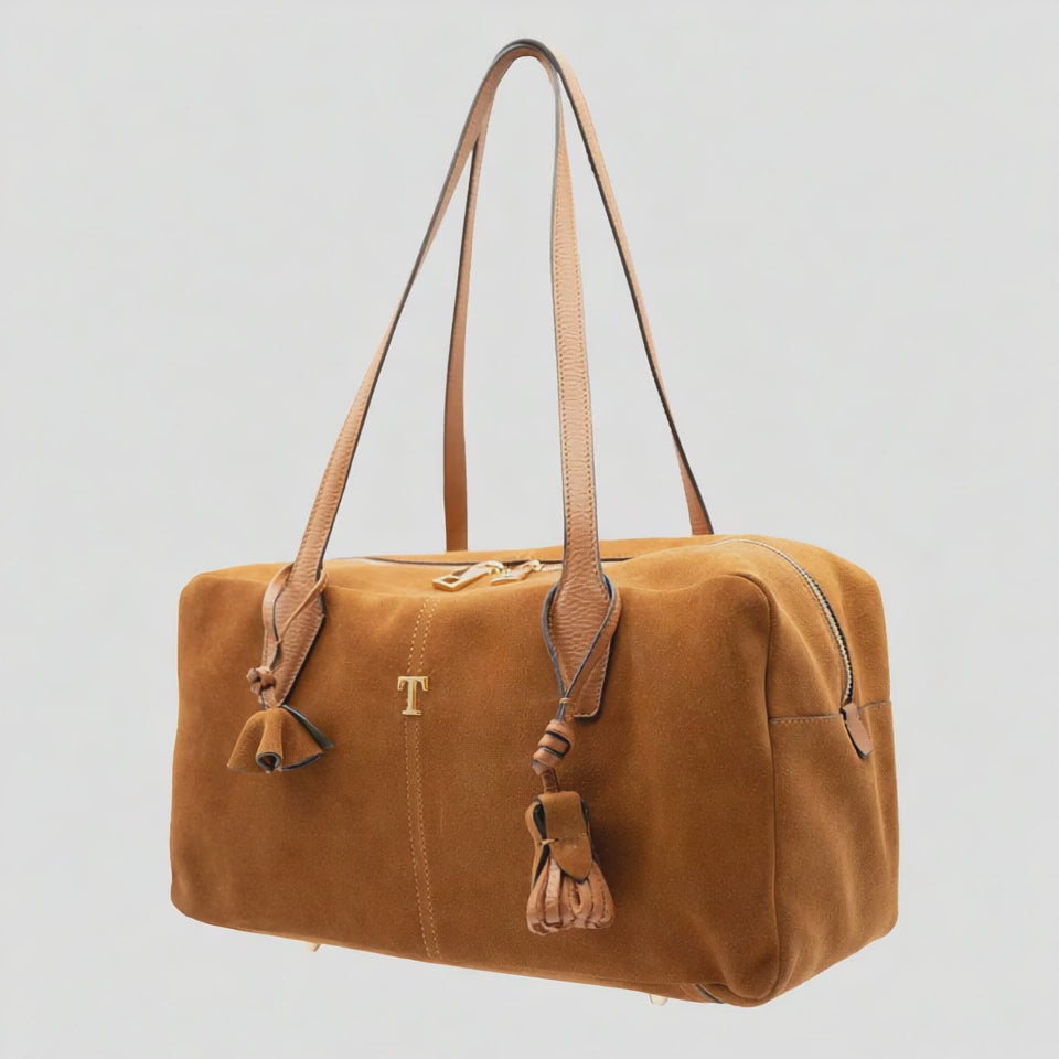 The two smooth leather handles offer a comfortable and refined grip, creating a pleasant textural contrast with the suede body of the bag. The central double zip closure ensures practicality and security, adding a touch of balance and symmetry to the design.