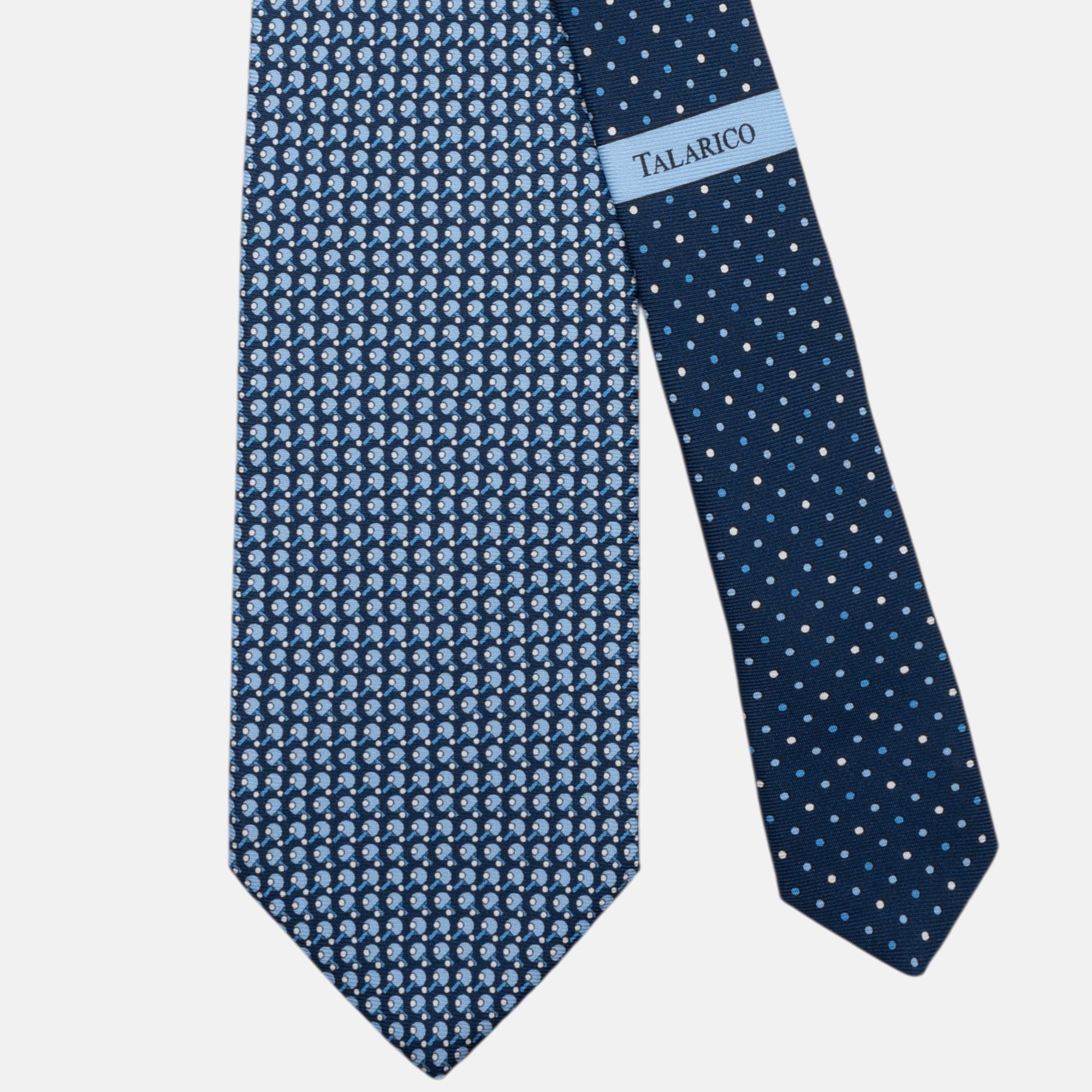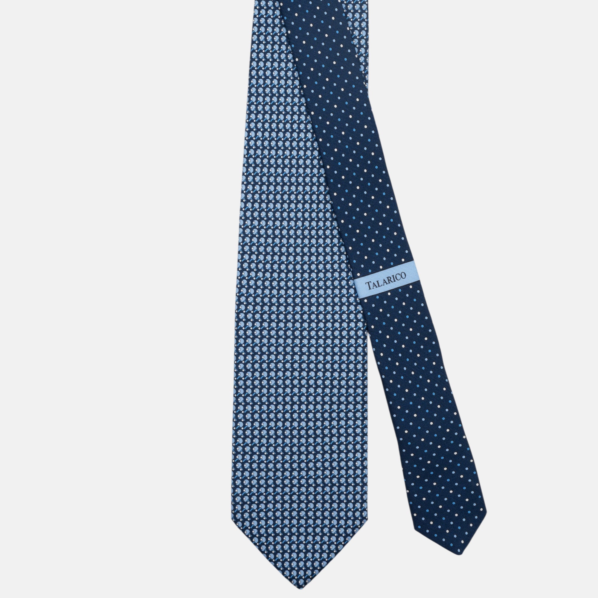 Colore e Fantasia: Fondo blu navy con un raffinato micro-motivo a "racchettoni" incrociati.
