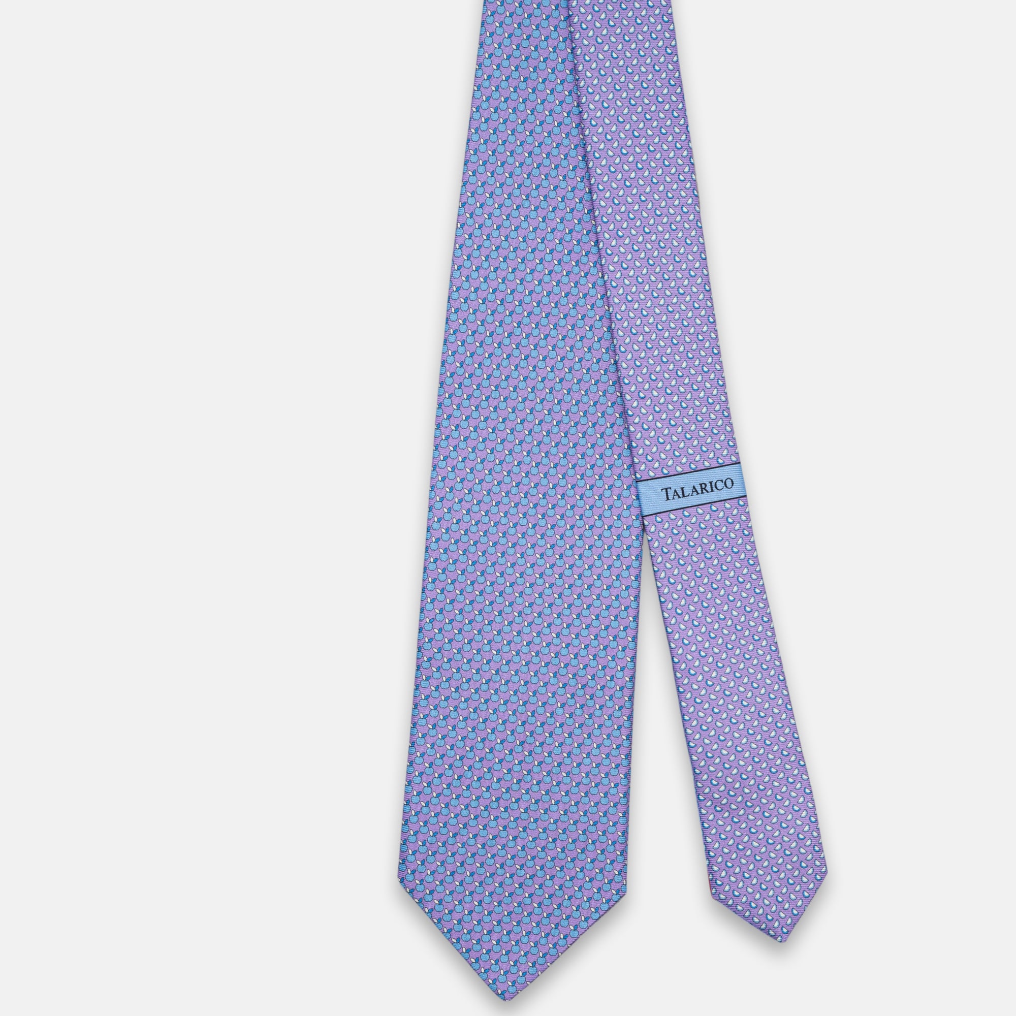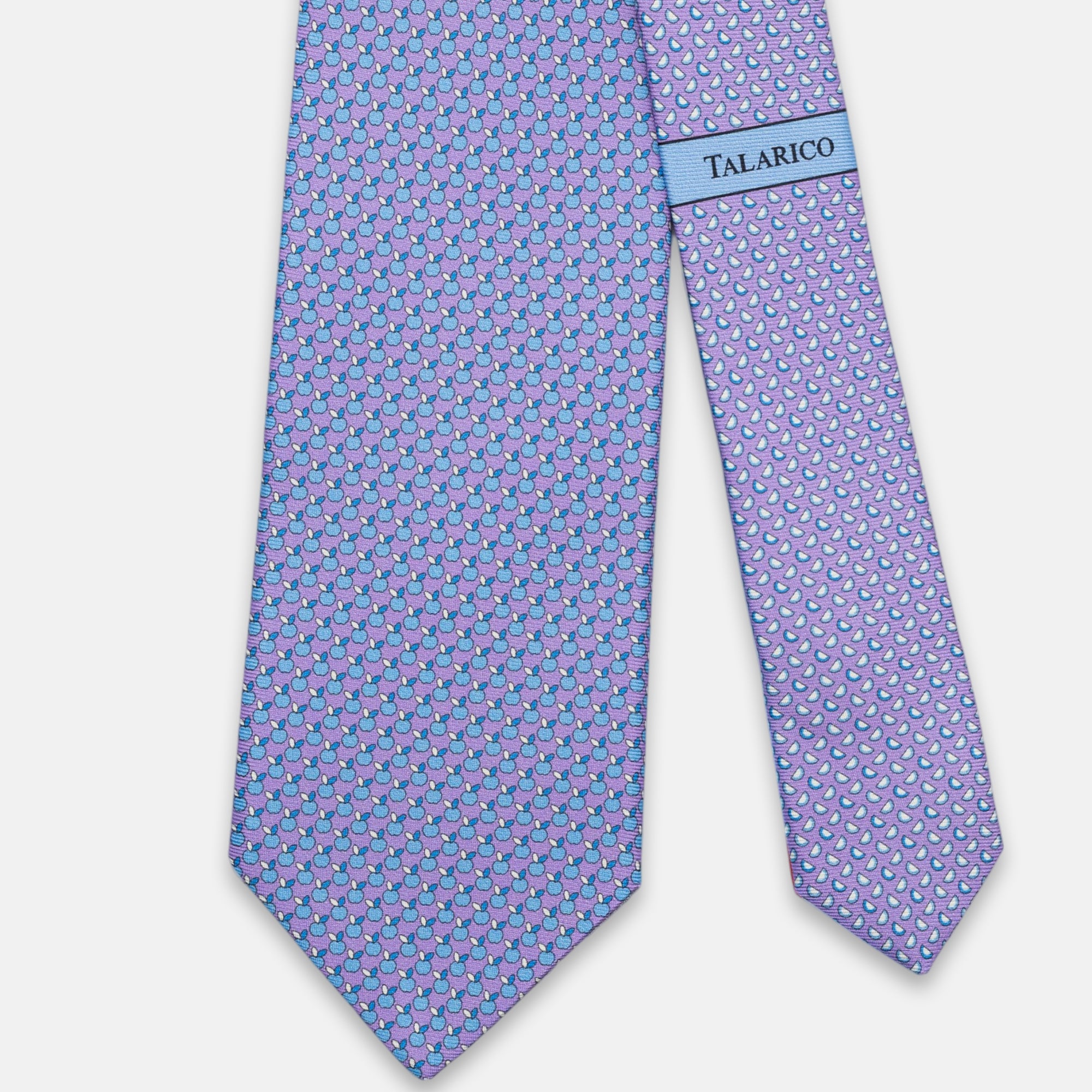 Il lilla è una nuance sofisticata, fresca e di grande tendenza, capace di ingentilire il rigore formale. L'aggiunta del micro-motivo a mela regala un tocco di originalità e sottile ironia a chi la indossa.
