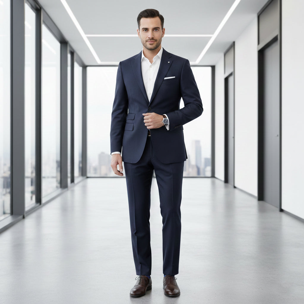 La giacca presenta linee pulite e un taglio sartoriale che valorizza la silhouette, mentre il pantalone completa l’insieme con equilibrio e raffinatezza. La lana pura garantisce un aspetto elegante, una caduta perfetta e una sensazione di calore e morbidezza, rendendo il completo adatto alla stagione e perfetto per un uso quotidiano o cerimoniale.