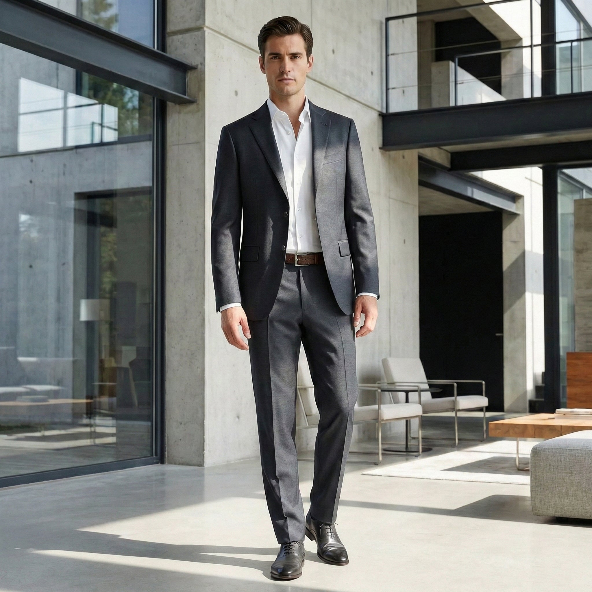 La giacca presenta linee pulite e un taglio sartoriale che valorizza la silhouette, mentre il pantalone completa l’insieme con equilibrio e raffinatezza. La lana pura garantisce un aspetto elegante, una caduta perfetta e una sensazione di calore e morbidezza, rendendo il completo adatto alla stagione e perfetto per un uso quotidiano o cerimoniale.
